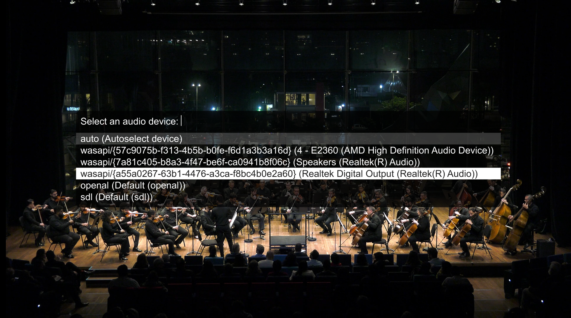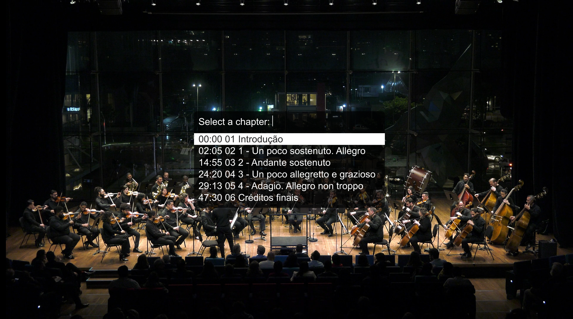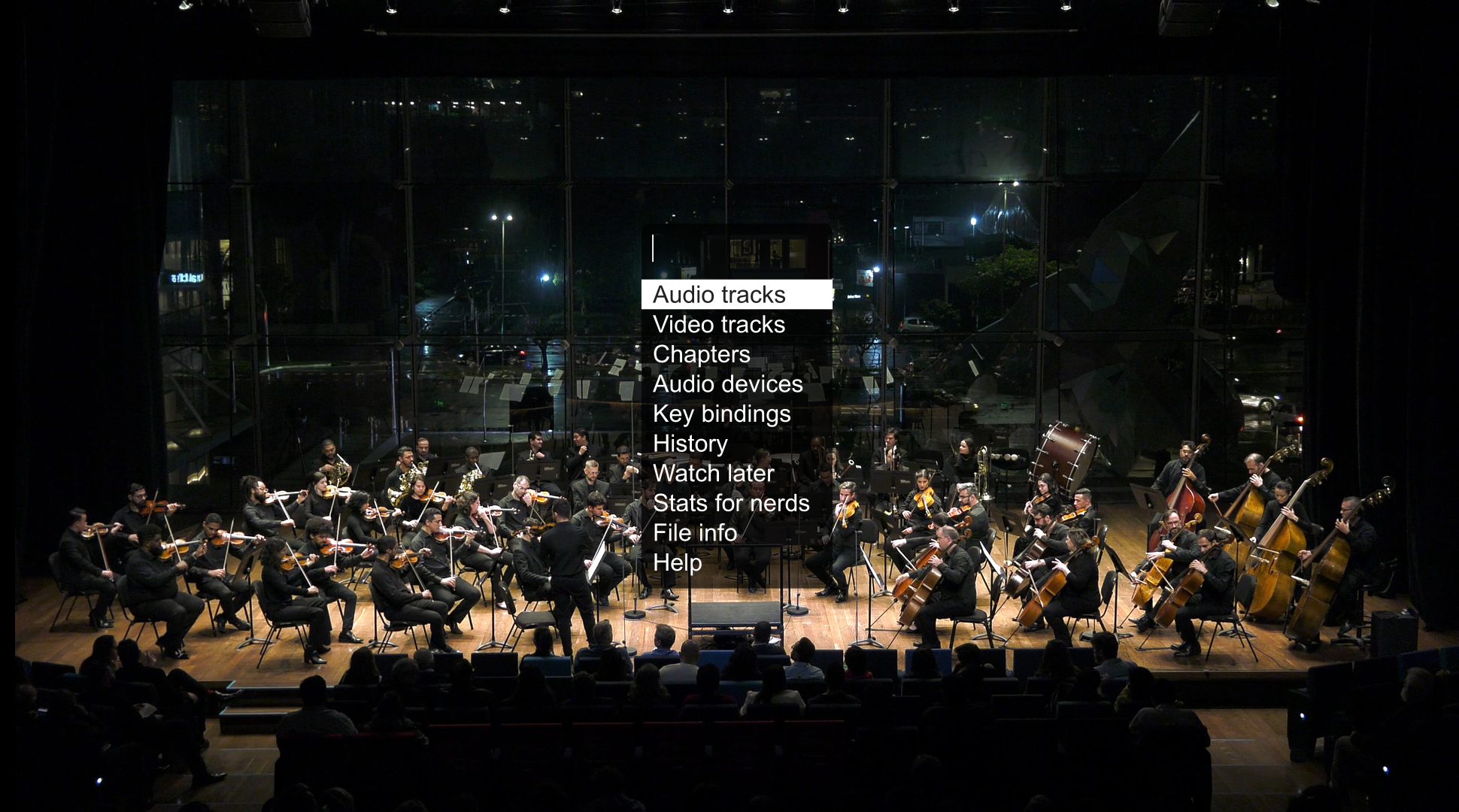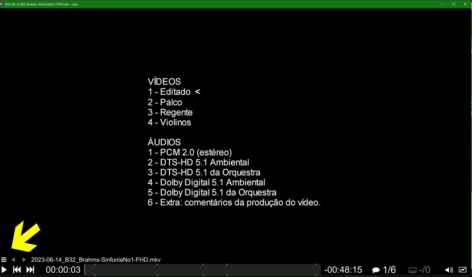 Aparecerá um menu com opções para selecionar áudio, vídeo, capítulos (chapters), saída de áudio do computador, entre outros.
