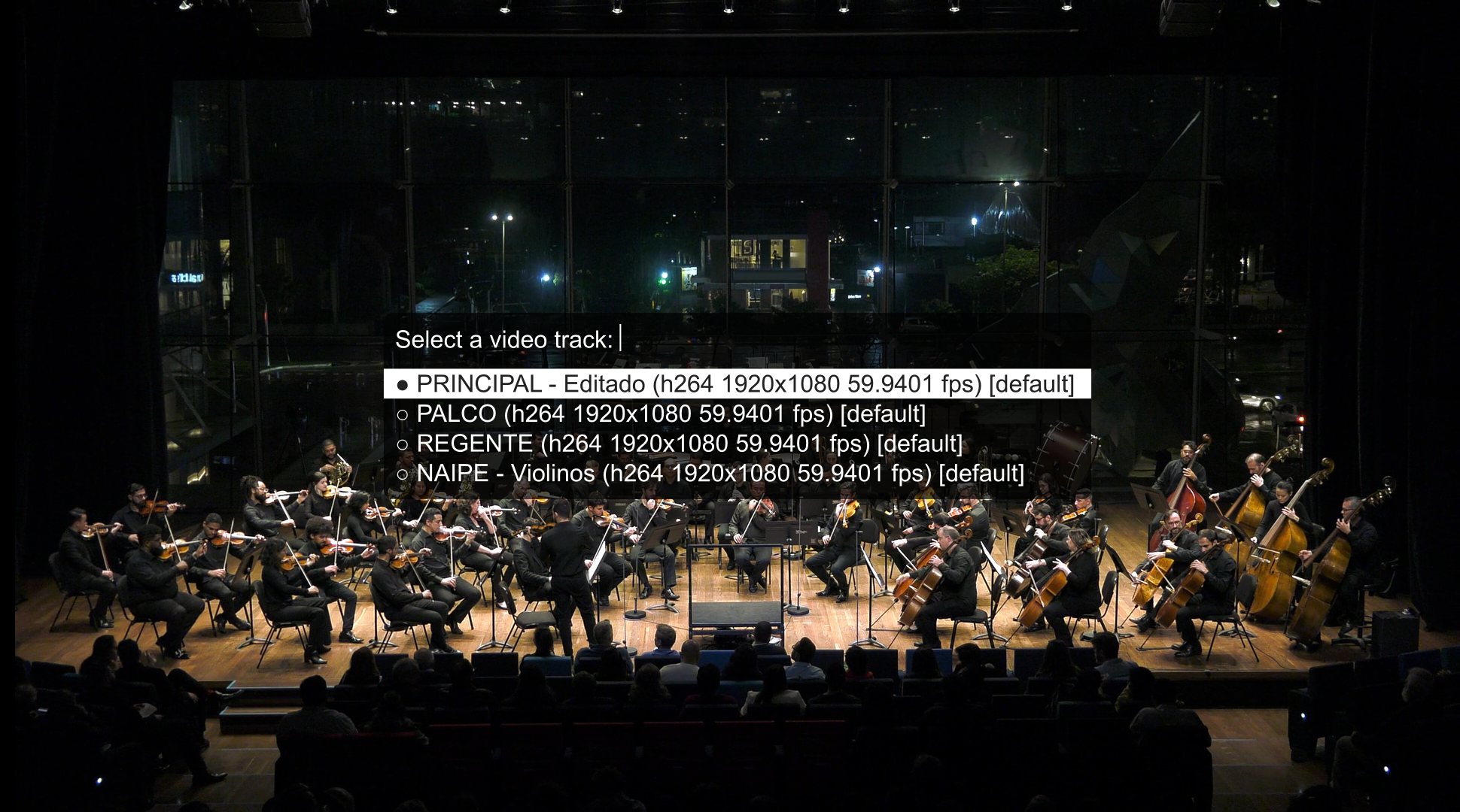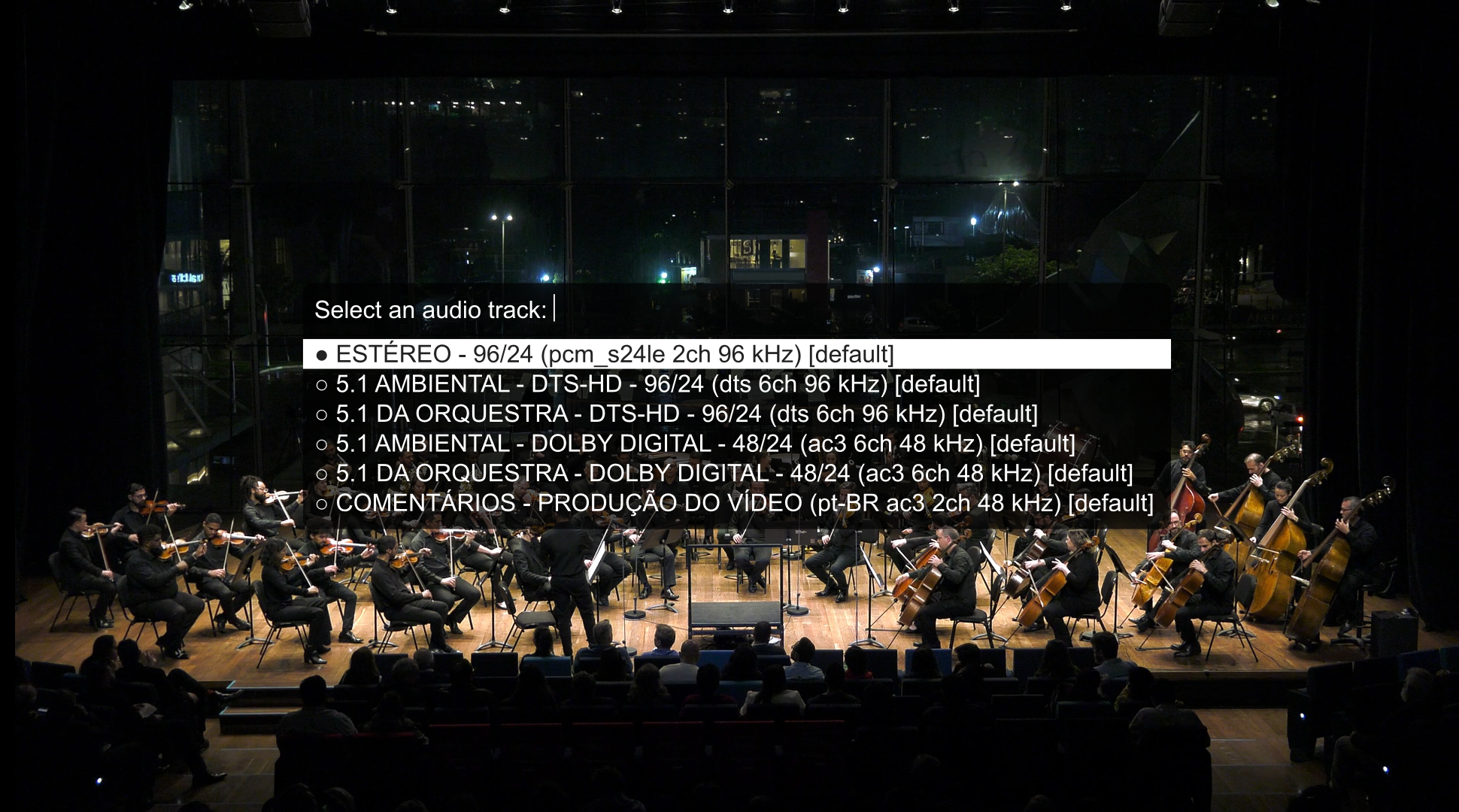 Com o vídeo rodando, você pode escolher qual trilha de vídeo assistir e qual trilha de áudio ouvir, clicando no botão de 3 linhas no canto inferior esquerdo da tela (ver imagem abaixo).